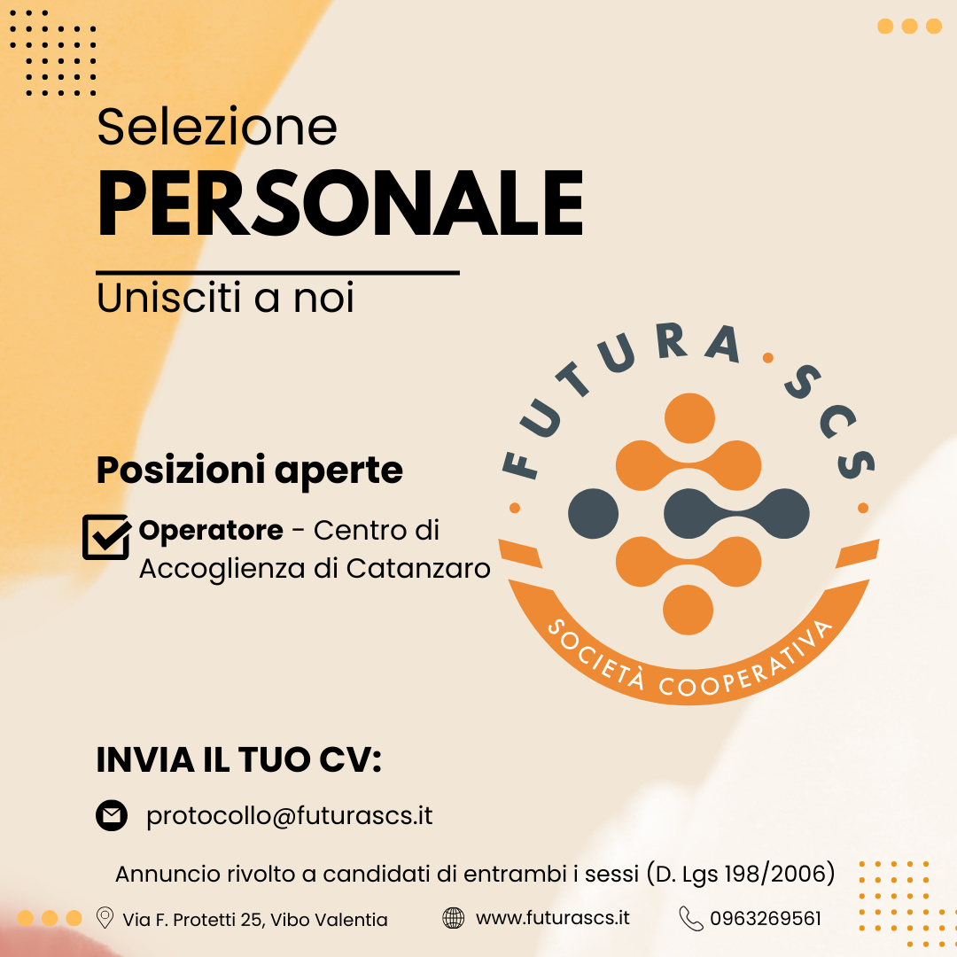 Siamo alla ricerca di un Operatore di Struttura da inserire nell’equipe del nostro Centro di Accoglienza Straordinaria (CAS) di Catanzaro Mansioni principali: Supporto quotidiano agli…